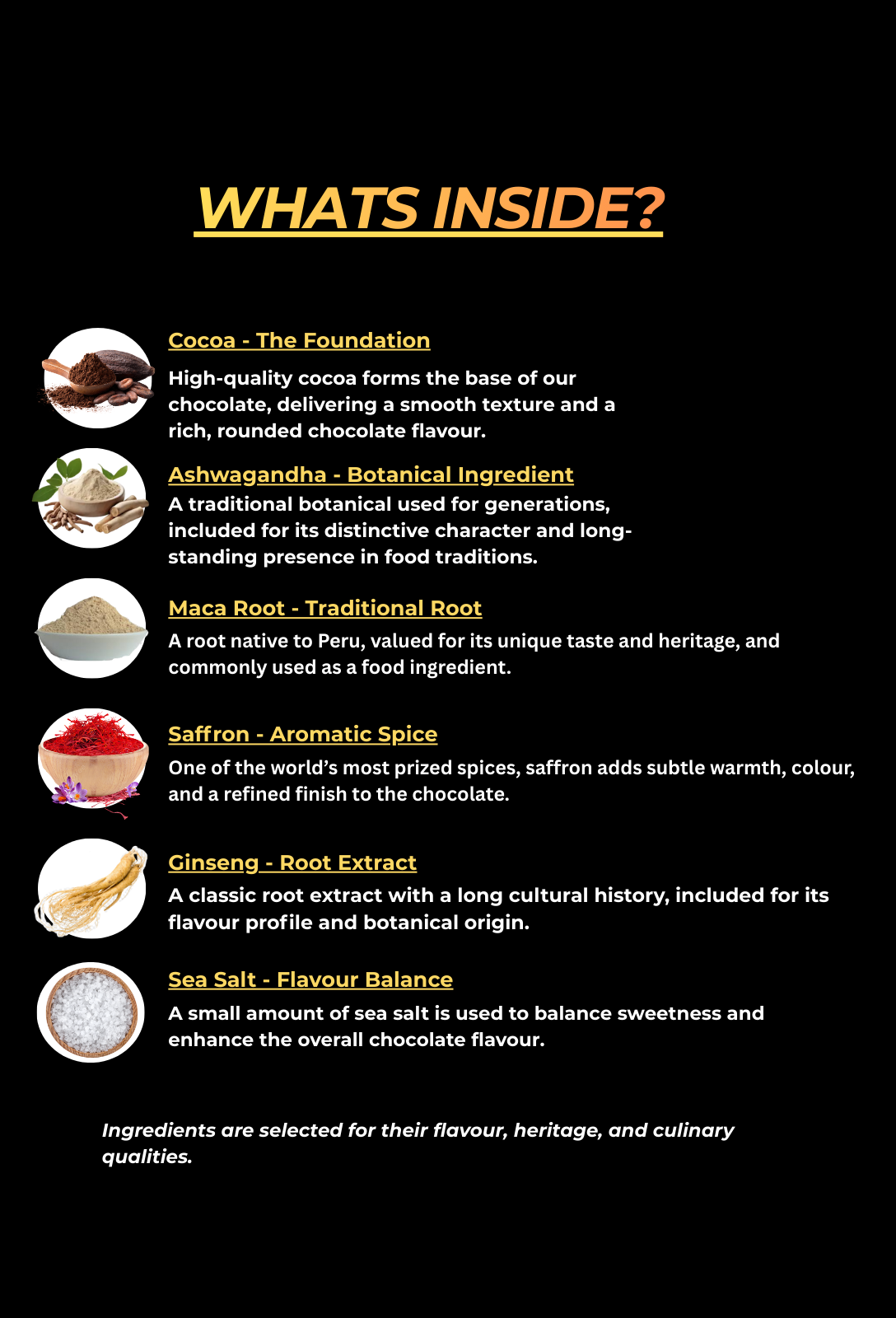 This first small batch blends smooth cocoa with carefully selected herbs, crafted as a bold, savory-sweet concept for couples who want something indulgent β and a little different.
